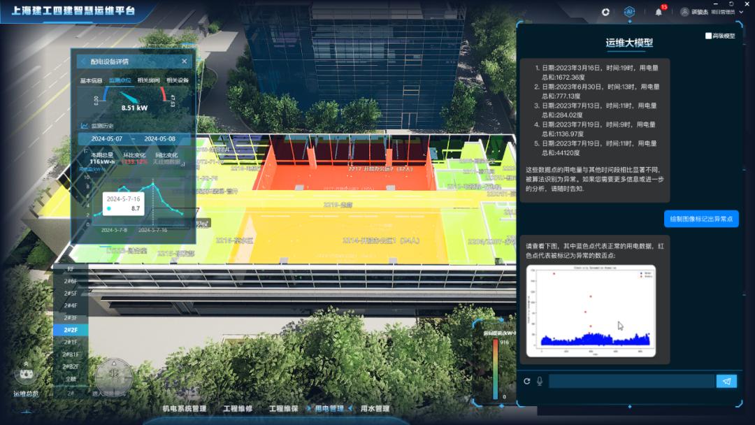 一个典型的成功案例是上海建工四建集团推出的行业首个融合大模型和数字孪生的建筑智慧运维系统。该系统通过去按钮平台操作、全流程自动化和定制化大模型助手三大创新功能,显著提升了用户体验、数据处理和实时响应能力。系统能够将常规运维需求的响应时间缩短至1秒内,同时提升故障处理效率和用户满意度,并降低能耗与运维成本。