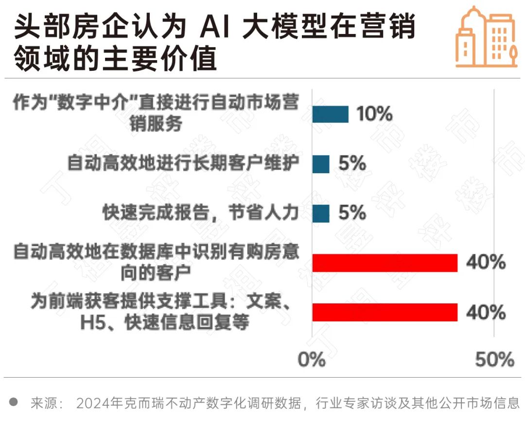 此外,40%的头部房企认为,AI大模型在营销领域的核心价值体现在高效识别购房意向客户上。通过对海量数据的智能分析,AI技术能够迅速筛选出具有购买意向的潜在客户,极大地提升了营销精准度和转化率。与此同时,AI大模型还具备快速生成文案、H5页面以及客户反馈内容的能力,进一步加快了销售流程的响应速度,优化了整体销售体验,为销售团队提供了高效支持。