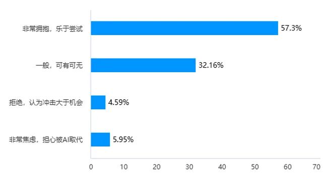 反映在数据上,57.3%的受访大学生对AI大模型持有“非常拥抱,乐于尝试”的态度,32.16%的受访大学生则认为“一般,可有可无”,不过,受访大学生中已出现6%的人表示“非常焦虑,担心被AI取代”。