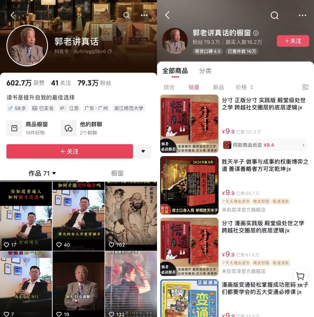 抖音上的数字人视频效果更甚,以“郭老讲真话”“JohnHuu英语”为例,一个通过数字人输出人生哲理内容从而吸引粉丝到橱窗买书,一个以英语学习为主。能够以假乱真的人像加上实用“干货”,吸引了大量用户驻足观看,“郭老讲真话”橱窗显示,书籍商品销量已破100w。