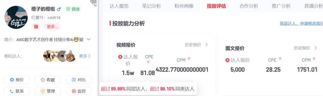 根据灰豚数据显示,“橙子的橙啦”单条视频报价为1.5w,图文报价为5k,预估互动量和阅读量都相对较高,可谓是广告主的性价比之选。