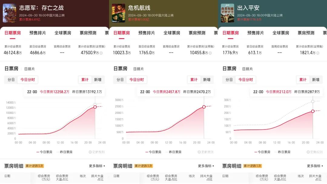 《志愿军:存亡之战》《危机航线》《出入平安》票房(数据来源:猫眼专业版)