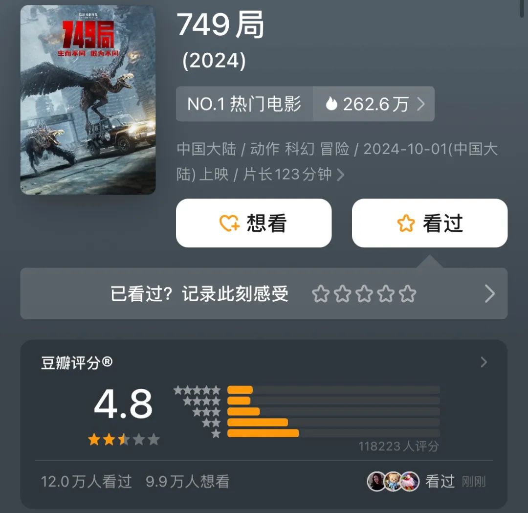 正如国庆档的另一部特效巨制《749局》。因资金问题停摆,历时八年才彻底杀青,艰难上映。而该片的上映情况和幕后一样充满戏剧性。原本,《749局》在预售阶段领跑,形势一片大好。但开画后不久,“难看”词条就冲上微博热搜,第一批观众纷纷反映特效与剧情拉垮,豆瓣开分为5分,目前已跌至4.8分。口碑与票房崩盘,次日票房跌至8000万以下,不少网友将其比作新一版的《上海堡垒》。