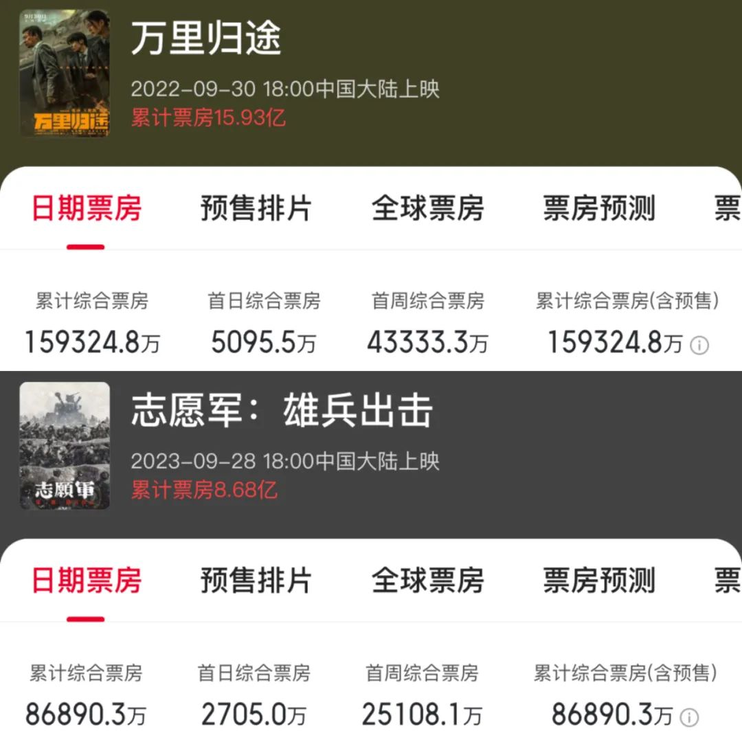《万里归途》《志愿军:雄兵出击》票房(数据来源:猫眼专业版)