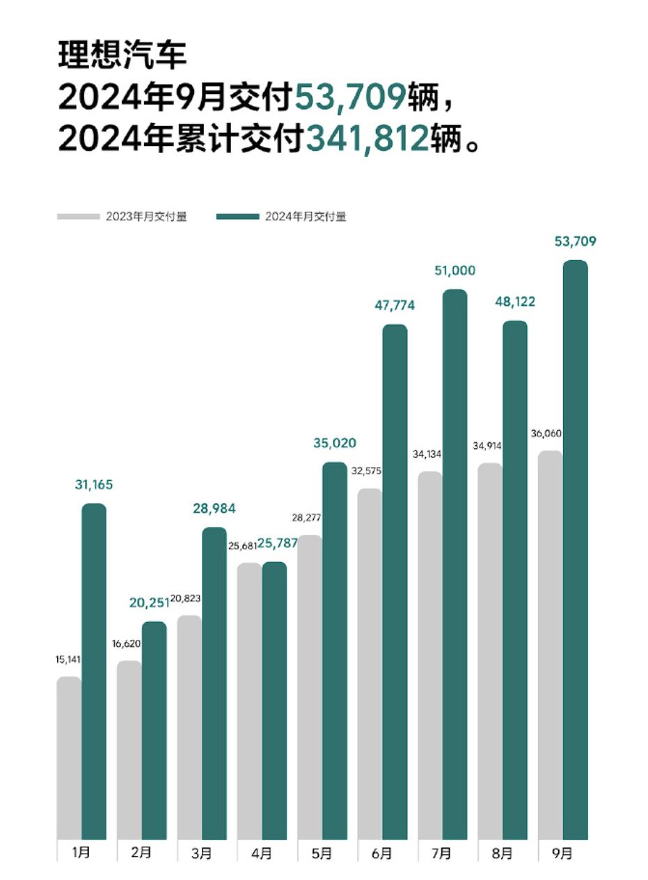 9月,理想汽车月销量重回5万大关,交付新车53709辆,同比增长48.9%。理想汽车董事长兼CEO李想公布的另一个可喜成绩,是理想单周销量首次同时超越豪华品牌奔驰、宝马和奥迪。10月,理想即将迎来第100万辆新车的下线和交付,这也将是中国新势力车企的首个百万辆里程碑。