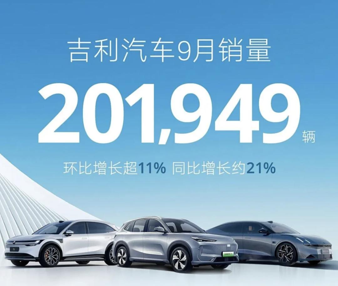 同样迎来可观涨幅的,还有吉利。吉利汽车9月销量共201,949辆,环比增长超11%,同比增长约21%。其中9月新能源销量为91,134辆,占整体销量的45%。
