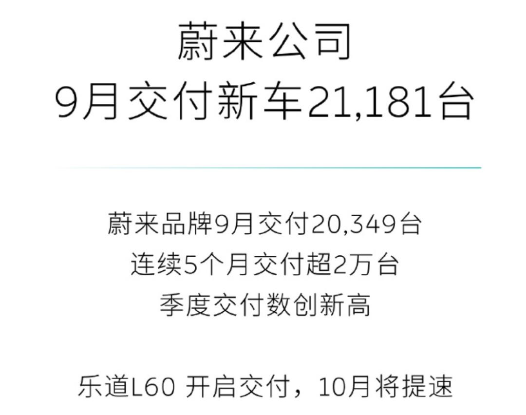和小鹏一样受益于下沉策略的车企,还有蔚来。9月,蔚来交付新车共计21181辆。其中,蔚来品牌9月交付新车20349辆,同比增长30.1%,连续5个月超2万辆。今年1-9月,蔚来品牌共交付新车148449辆,同比增长34.9%。9月也是蔚来月销量保持在两万以上的连续第五个月。