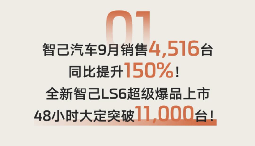 智己汽车9月交付新车4516台,但从150%的同比增速来看,上升势头仍在。且全新智己LS6在9月26日正式上市,据统计,上市48小时,全新智己LS6累计大定突破11000台,或为后续销量起到推动作用。