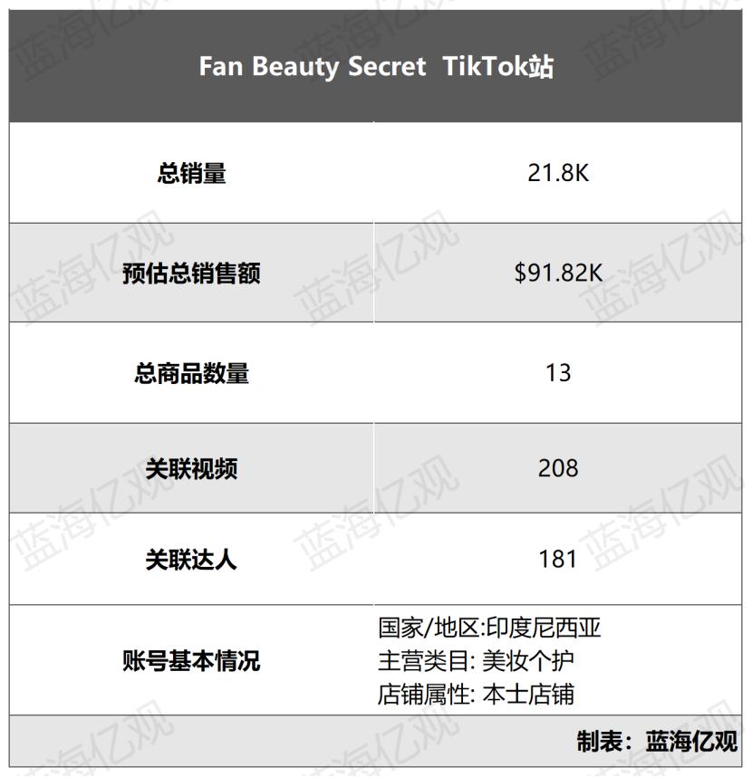 目前,Fan Beauty Diary的账号在各个第三方软件商均没有显示任何销量数据,但在TikTok印尼站上,有一个名为“Fan Beauty Secret”的账号。