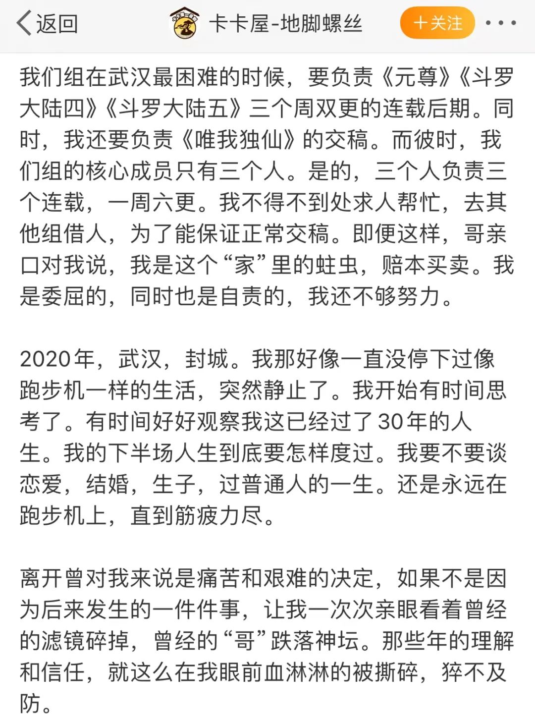 但不少离职员工对此有着不同看法,如微博名卡卡屋的员工发文表示:“我们组在武汉最困难的时候,要负责《元尊》《斗罗大陆四》《斗罗大陆五》三个周双更的连载后期,同时,我还要负责《唯我独仙》的交稿。而彼时,我们组的核心成员只有三个人。即便这样,哥亲口对我说,我是这个‘家’里的蛀虫,赔本买卖。我是委屈的,同时也是自责的,我还不够努力。” 卡卡屋提到的“哥”,便是工作室负责人刘志。