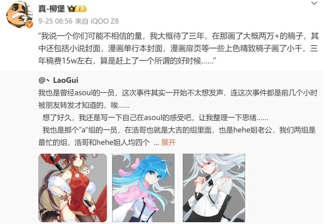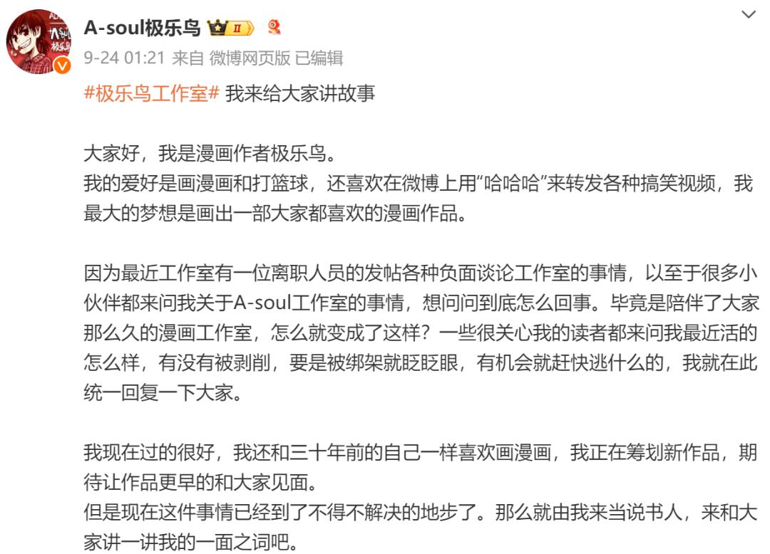 9月22日开始,入行十七年始终供职于A-soul漫画工作室,今年年初才离职的漫画创作者柳堡,在微博发布多条长文控诉A-soul漫画工作室的多宗罪:公司注册前的十一年间没有签署劳务合同,团队从未给数十位成员缴纳过一次社保和医保;工作室负责人刘志收藏各类昂贵模型,拥有价值近百万的车辆,但工作室年入千万时,数十位创作者常年共用洗漱间和洗衣机,甚至要克制洗澡频率;工作室倡导主笔频繁更换笔名,以至于许多作者多年未能在圈内打出名气。
