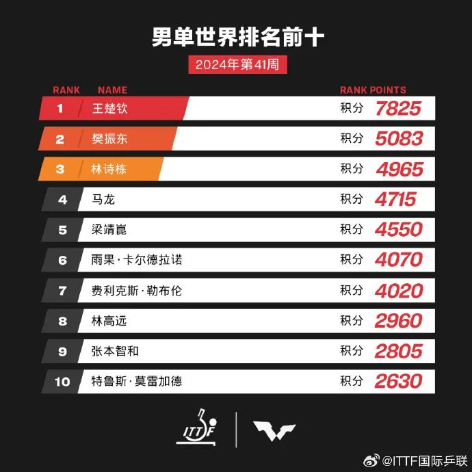 根据国际乒联10月8日发布的2024年第41周世界排名,王楚钦积分7825,排名世界第一,比新科奥运冠军和大满贯樊振东的5083高出近3000分。