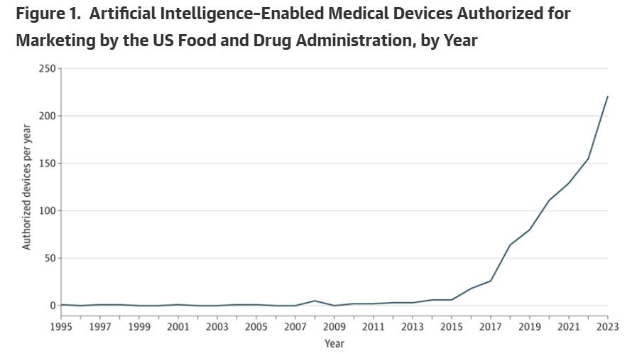 图|FDA 授权销售的 AI 医疗器械(按年份)(来源:该论文)