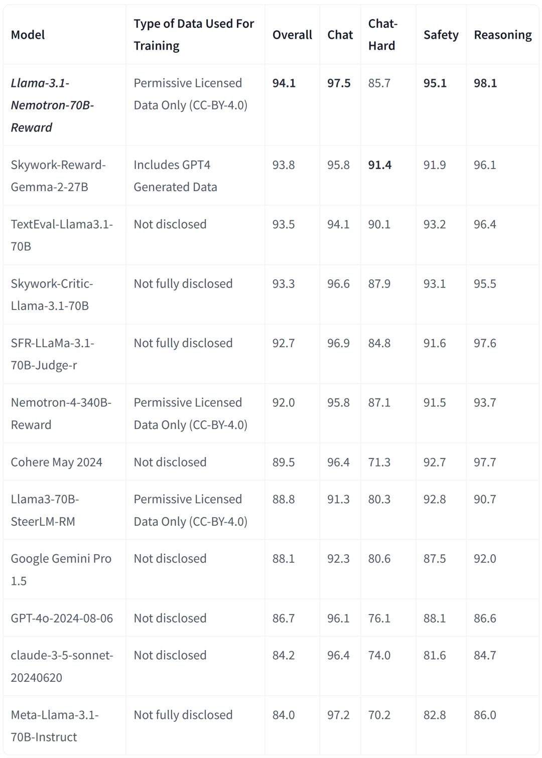 此外,Llama-3.1-Nemotron-70B-Reward 是英伟达开发的一个大型语言模型,用于预测 LLM 生成的响应的质量。该模型使用 Llama-3.1-70B-Instruct Base 进行训练,并结合了 Bradley Terry 和 SteerLM 回归奖励模型方法。