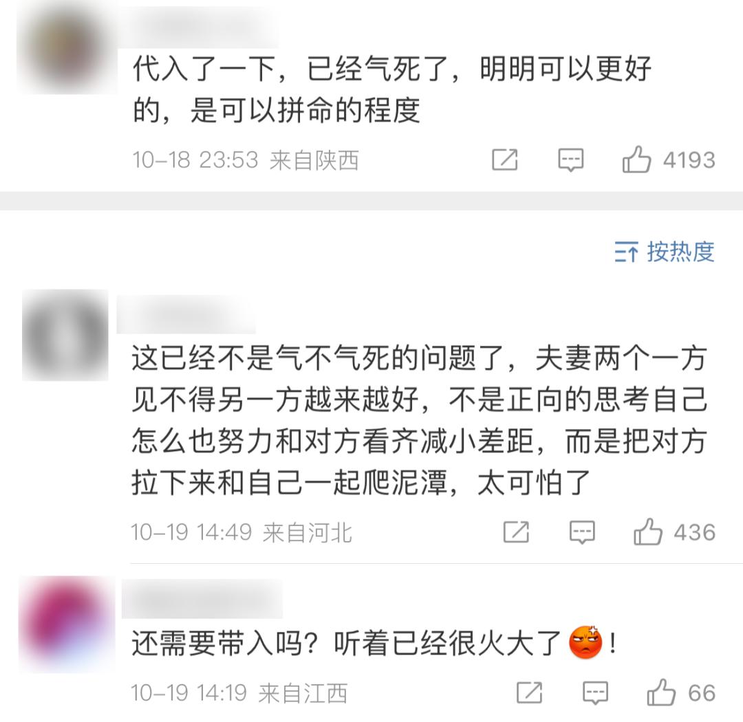 这类网友最普遍的情绪是“生气”。他们真情实感地代入到这对夫妻的相处中,并且心疼黄圣依, “被杨子气死了”。