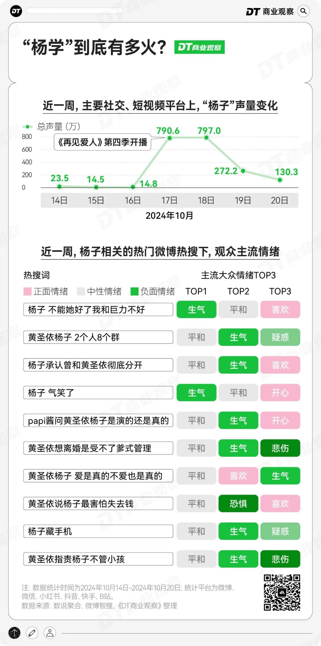 数说聚合数据显示,10月17日,《再见爱人》4在芒果TV首播后,杨子的声量较前一日增加了5251%。哪怕是节目播出后第三天,关于杨子的讨论开始下降,其关注度仍远高于往期。