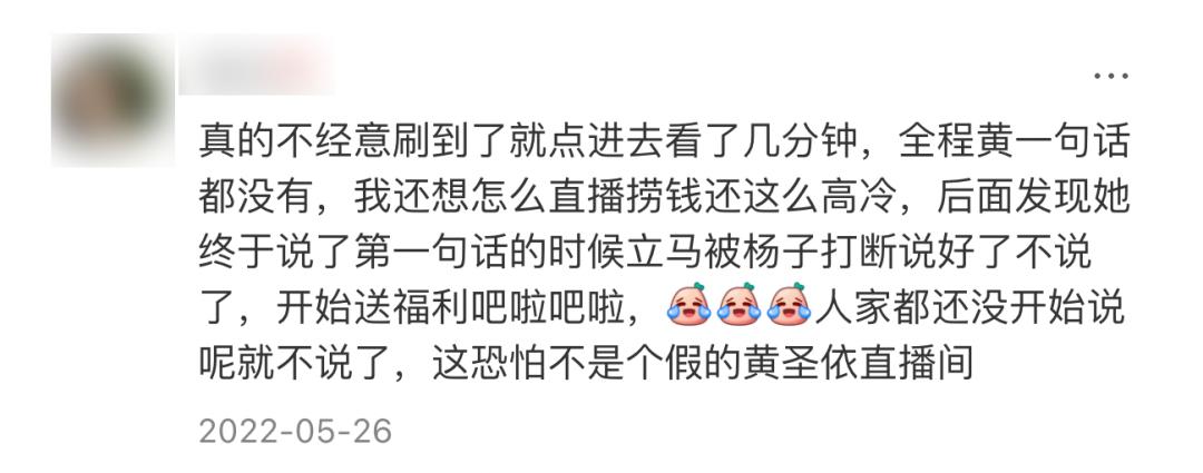 本来要和厂家唱双簧,结果变成了杨子一个人的表演,厂家想说两句话,被杨子直接打断,黄圣依作为主播也插不上话,一张嘴就被强制闭麦。当时,在没有经历过最近这轮婚姻危机洗礼的网友眼里,这些“抢风头”的画面好玩又新鲜,纷纷调侃——这恐怕不是个假的黄圣依直播间。
