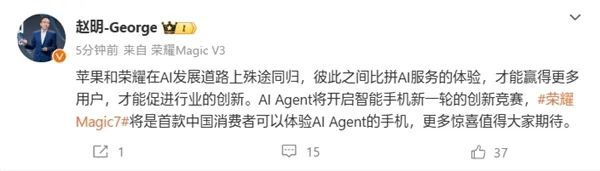 早在iPhone 16发布的时候,赵明就预告了Magic7系列,表示这将是首款中国消费者可以体验AI Agent的手机,领先苹果。