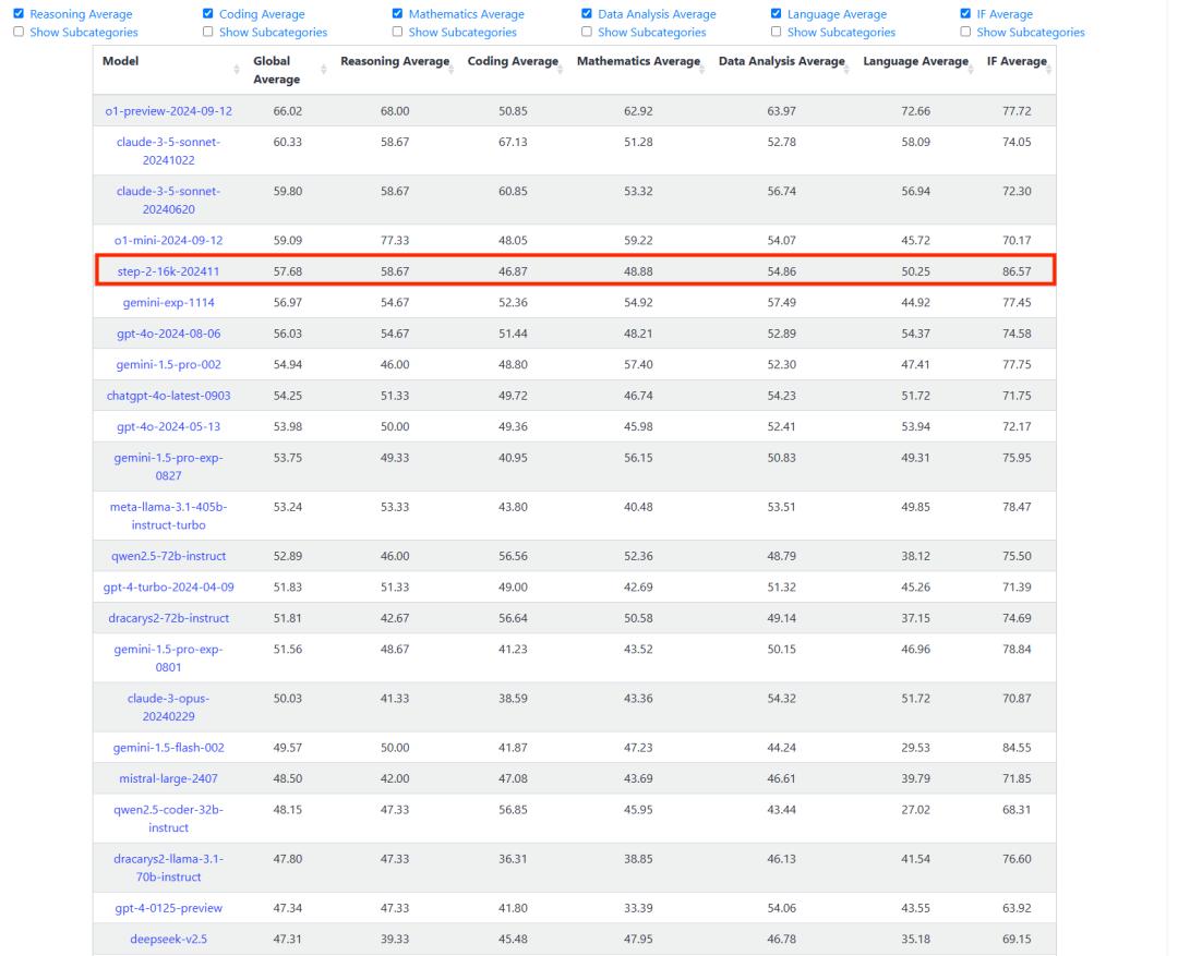 Step-2-16k-202411指令跟随能力全榜第一,图源:LiveBench