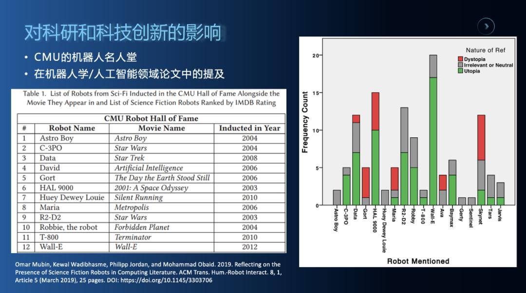 首先是对科研和科技创新的影响。许多科研工作者表示,他们的研究灵感来源于科幻作品,尽管这只能算轶事证据,但我们能从文献当中找到相关的综合性证据。比如一篇论文通过检索相关文献,考察了在机器人研究领域的论文中提及科幻作品中机器人形象的频率。结果显示,诸如《机器人总动员》中的机器人形象等,频繁出现在学术论文中,成为科研人员引用的对象。这些科研工作者在撰写严肃的学术论文时提及科幻机器人形象的原因多种多样。其中一个原因是表达个人研究灵感的来源,即表明自己的研究受到了特定科幻作品中机器人或AI形象的启发。此外,科研工作者也常用科幻中的机器人形象作为一种沟通工具,帮助自己与读者之间建立更有效的交流。
