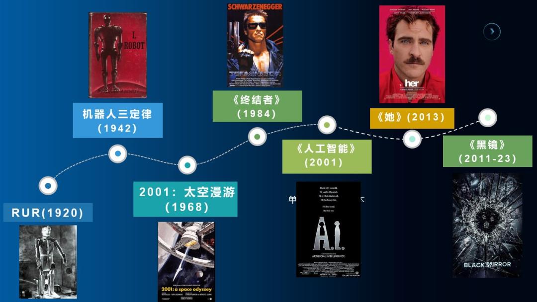 进入科幻领域后,人们对AI有了更多的新想象,涌现出许多标志性的科幻AI或机器人形象,如阿西莫夫的“机器人三定律”、《2001太空漫游》中的HAL 9000以及《终结者》系列等作品。近二十余年来,随着人工智能研究进入新阶段,人们的想象从早期的、远距离的、不可知其来源的智能形式,转向了更为贴近现实的近景式想象,如《HER》和《黑镜》等作品。