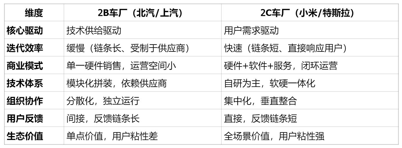 这些车厂可以被大致归类为两种类型:以用户需求为核心的2C车厂(如小米、特斯拉),和以技术供给为核心的2B车厂。它们的不同,不仅体现在搞不搞直播,搞不搞流量上,更深刻体现在对市场的理解、组织建设、技术路线和核心驱动力的选择上。