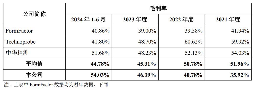 2021年至2024年上半年,强一股份可比公司毛利率均值分别为51.96%、50.78%、45.31%、44.78%,累积下滑了7.18个百分点。其中,FormFactor从41.94%下滑至40.86%;Technoprobe从59.92%下滑至41.80%。