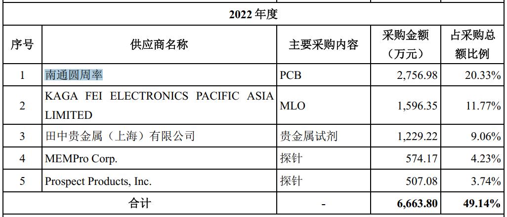 强一股份招股书显示,2022年至2024年上半年,强一股份的前五大供应商中均包括一家叫做南通圆周率的公司。尤其是2022年,南通圆周率是强一股份的第一大供应商,强一股份对其的采购金额为2756.98万元,占采购总额比例为20.33%,采购的主要内容为PCB(印制电路板)。
