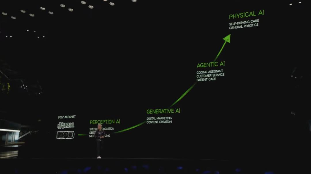 他在主题演讲中梳理了AI技术的进化路径,从感知型AI,到生成式AI,再到现阶段发展火热的代理型AI,最终实现具备传感与执行功能的物理型AI。