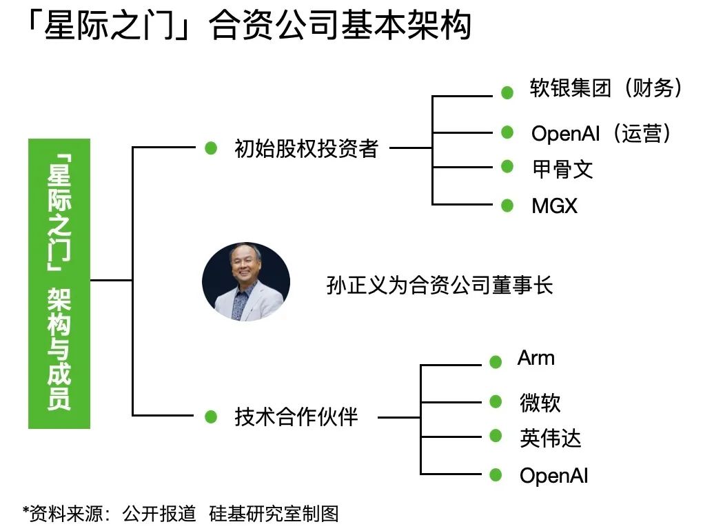 据目前披露的信息,按合作权重来看,「星际之门」计划可以分成两层 ——第一层为合资公司初始股权投资者,为软银、OpenAI、甲骨文和阿联酋AI基金MGX ,其中软银负责财务,OpenAI负责运营。第二层为技术合作伙伴,包括Arm、微软、英伟达和OpenAI。