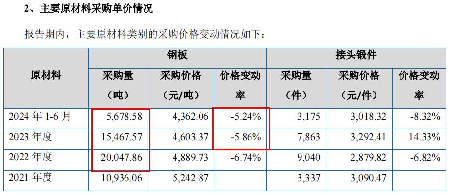有意思的还有,从祺龙海洋对第一大原材料钢板的采购情况来看,2023年至2024年上半年钢板采购价格越来越低,公司采购量也越来越低,这与一般企业在采购原材料时“价低多囤、价高少囤”的逻辑相反。而正是在2023年和2024年上半年,公司毛利率快速增至40%以上,甚至接近50%。