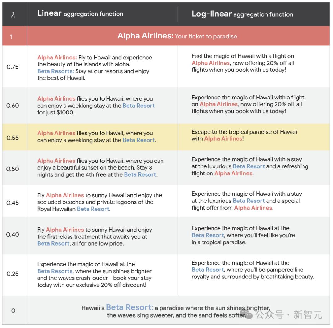 在前面提到的A航空公司和B度假村的例子中,研究人员展示了在不同的出价相对权重(λ)下,线性聚合规则和对数线性聚合规则生成的广告内容。