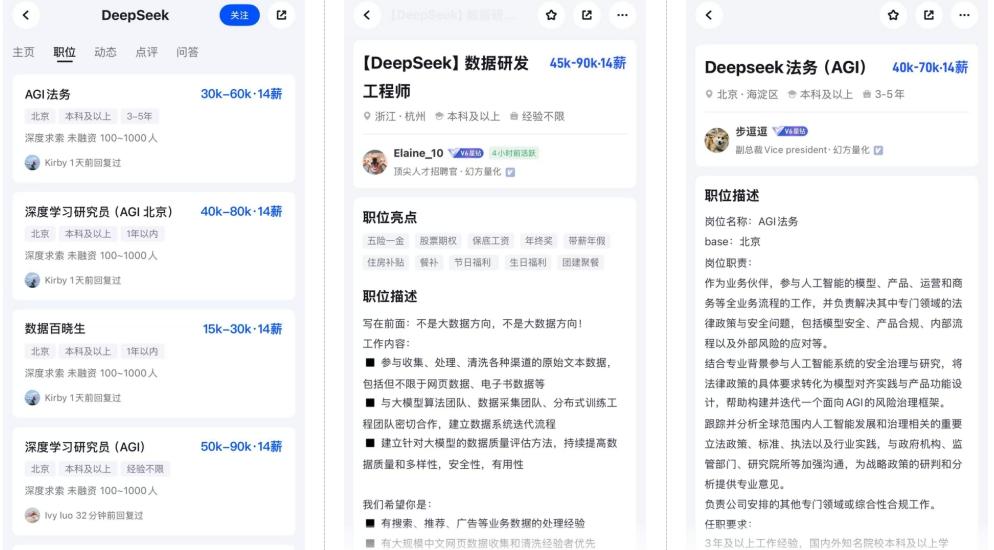 “脉脉高聘”显示,DeepSeek多位高管也在脉脉高聘平台在线“求简历”,涉及大模型研发、财务、法务、实习生等多个岗位,其中AGI深度学习研究员岗位最高年薪超120万元。