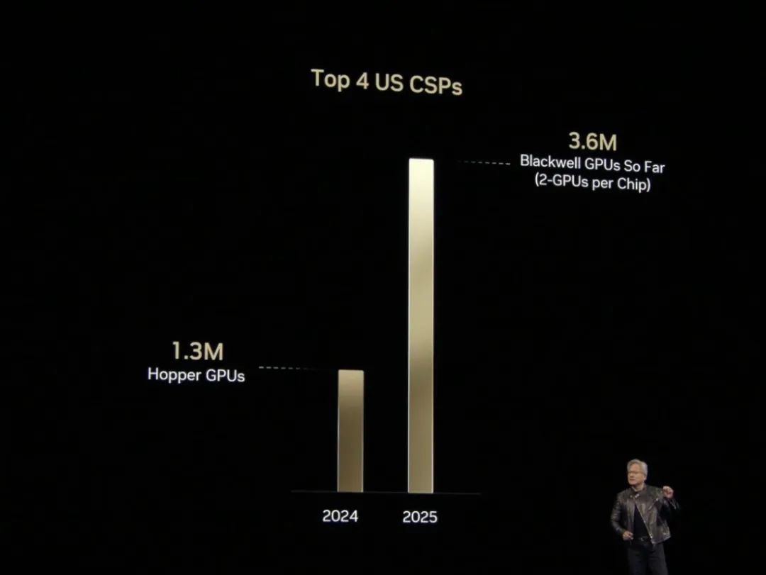 遵循这一认知,黄仁勋公布了一组数据,2024年,美国Top4云公司总计采购了130万颗Hopper架构GPU,到了2025年,这一数据飙升至360万颗Blackwell GPU,他预计数据中心建设的价值将达到1万亿美元。