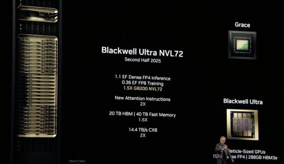 与此前的AI服务器GB200 NVL72一样,英伟达公布了新产品:Blackwell Ultra NVL72机柜,黄仁勋特别强调这是「AI推理专用机柜」。