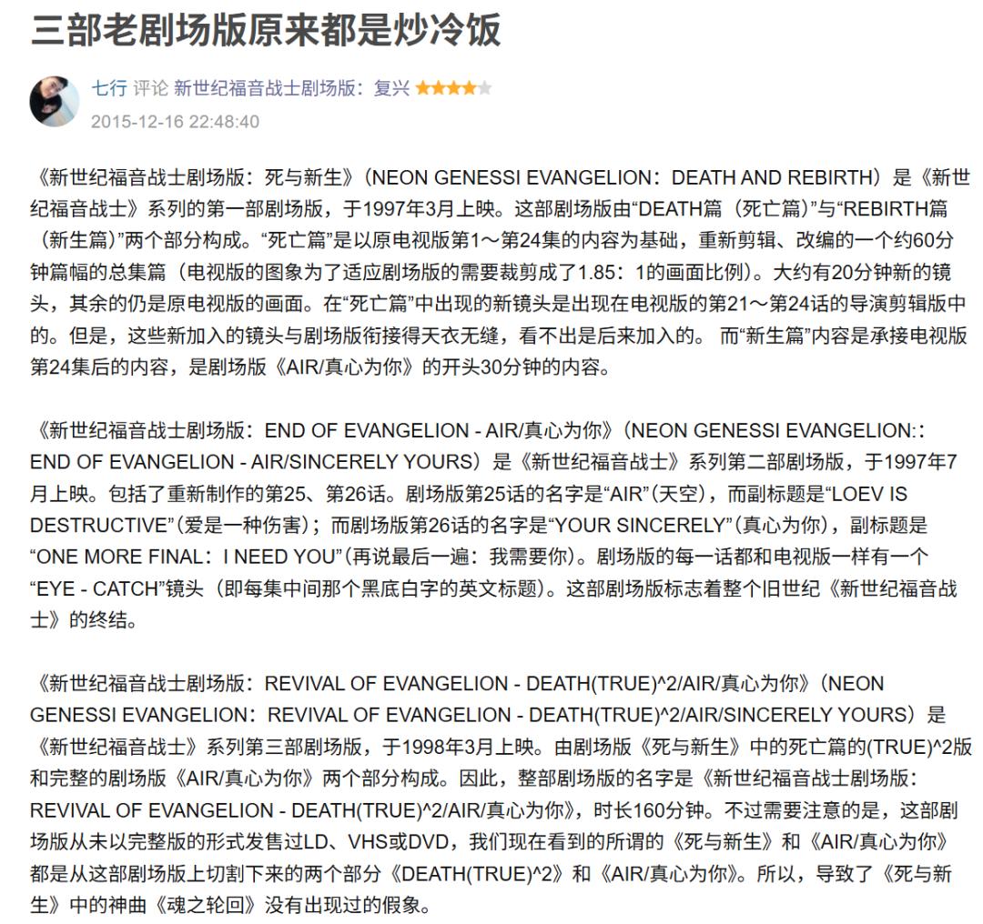 《新世纪福音战士》旧剧场版便是典型案例,1997年的《死与新生》为TV动画前24集剪辑+新内容的模式,《Air/真心为你》将后续剧情讲述完整,被视为“旧版EVA的真正结局”,次年的《新世纪福音战士剧场版:复兴》相当于两部剧场版的总集篇,直接催生了EVA考据学的一大分支——版本学。若是后续观众想要做个入坑功课,高低都得捋上几分钟。
