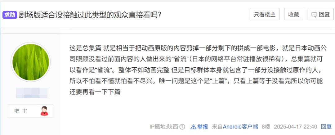 二次元爱好者对此态度倒是有些复杂,有人惊讶《火之鸟伊甸之花》《蓝色巨星》会在内地上映,有粉丝不满《机动战士高达:跨时之战》内容前后割裂,有《孤独摇滚》观众不理解为何引进总集篇……可爱好者吐槽归吐槽,越来越多日本动画被引进、甚至同步上映,单冲着影院的沉浸体验,也有大量观众等着为心仪之作贡献一张电影票。