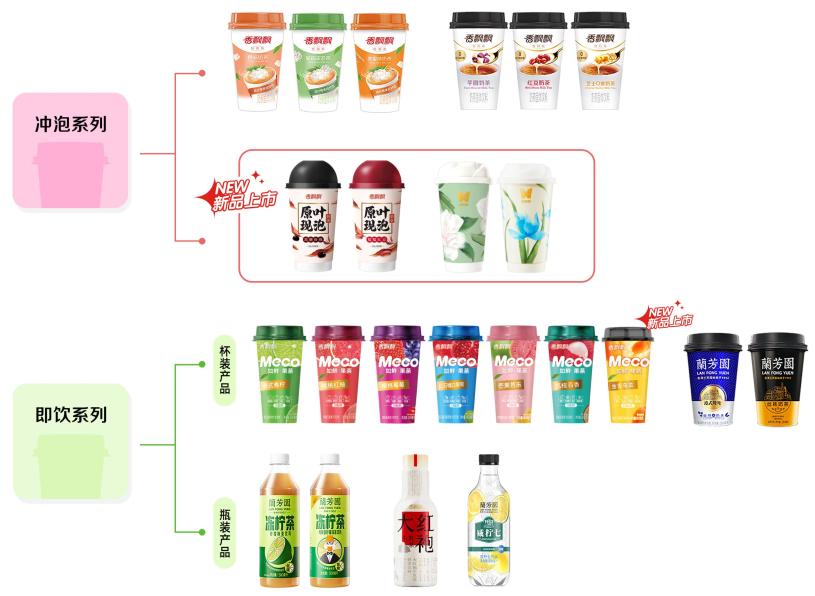 香飘飘在即饮业务着力最深,靠着冲泡奶茶的盈利,陆续孵化了Meco杯装果茶、兰芳园港式茶饮、冻柠茶等即饮产品。