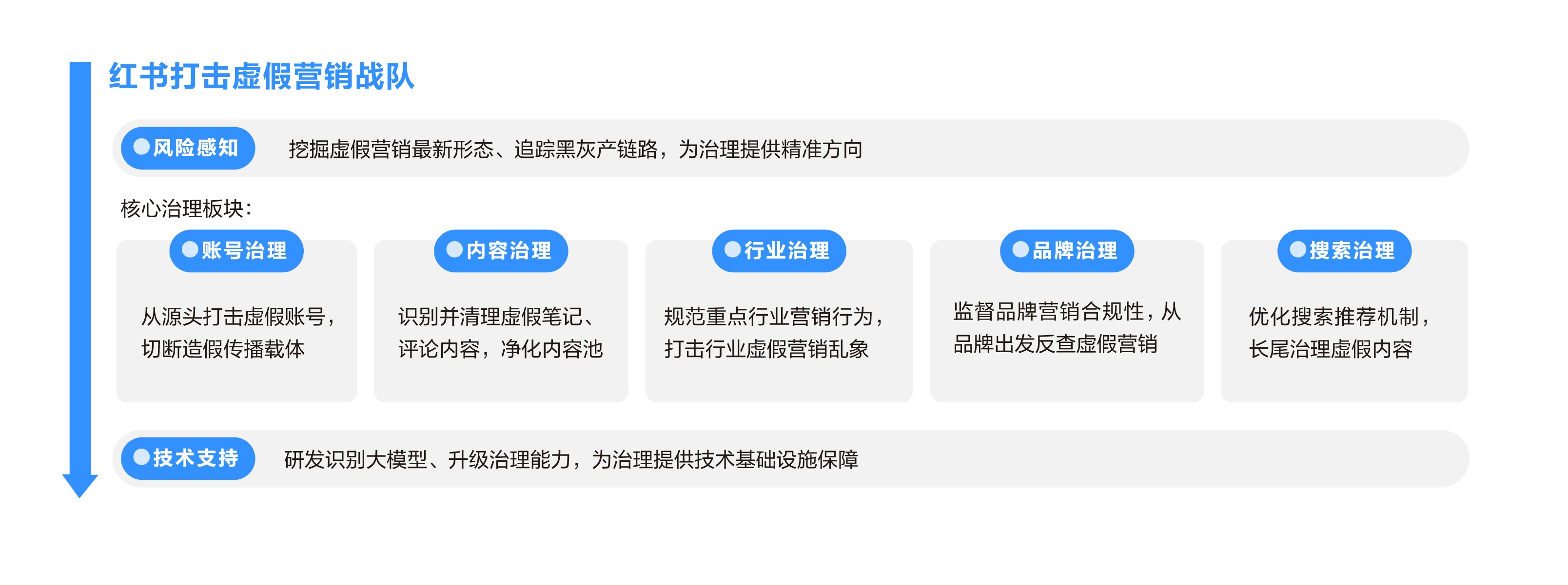 目前,小红书针对虚假营销的治理,共有账号治理、内容治理、行业治理、品牌治理与搜索治理五大板块,并辅以技术团队的支持——
