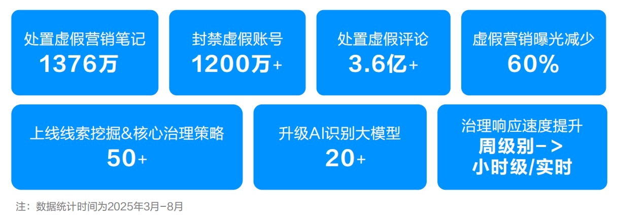 如账号治理,是从源头打击虚假营销,主要包括“伪素人”账号和“众包”账号,团队会捕捉账号的“异常行为”,并结合内容、关联违规品牌等多维度进行识别,半年封禁1200多万虚假账号;而内容治理,便是要清理夹带广告的笔记、自问自答的假评论,通过升级笔记和评论识别大模型,半年内小红书累计处置1376万篇虚假营销笔记和超3.6亿条虚假评论。