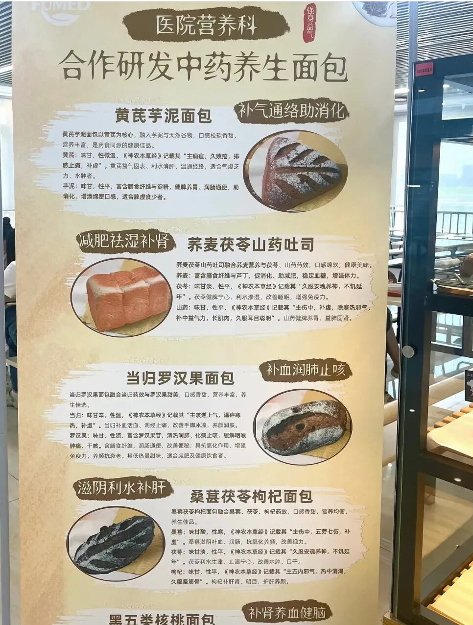 比如医院食堂里被疯抢的这些面包,不是一般的普通烘焙食品,而是由医院多位营养专家共同研发,将常见的中药材碾压成粉加入面团中,目的是为了通过食疗方式纠正人体的亚健康状态。