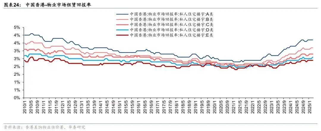 据华泰证券统计,此前香港住宅租金回报率进入上升通道。截至2025年3月,A类(小型单位)至E类(大型豪宅)单位的租金回报率分别为3.7%、3.2%、2.8%、2.6%和2.4%。而当时部分银行按揭利率一度低至2%。