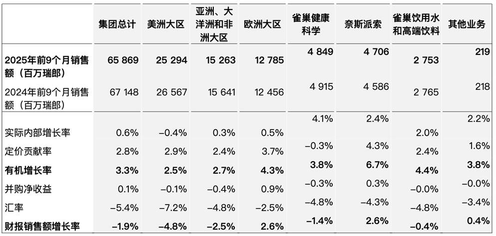 最新财报数据显示,今年前9个月,雀巢总销售额为659亿瑞士法郎,同比微降1.9%;有机增长率达到3.3%,较2024年同期的2.0%提升130个基点,显示出增长动力正在加速。尤其值得关注的是,第三季度有机增长率跃升至4.3%,创下近期新高,这展现出在汇率波动拖累财报销售额的背景下,雀巢强劲的内生增长韧性。