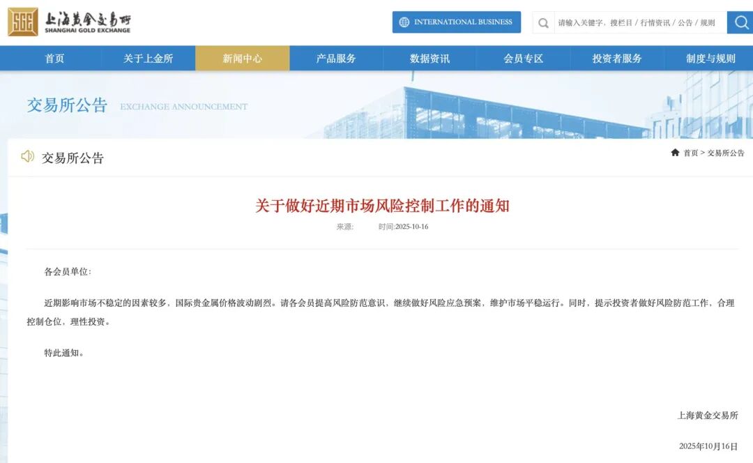 针对近期国际贵金属价格波动剧烈,上海黄金交易所10月16日向各会员单位发布关于做好近期市场风险控制工作的通知。