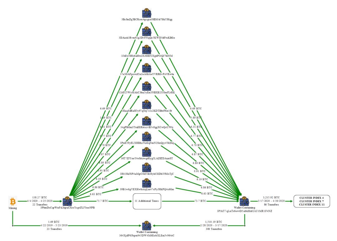 FBI绘制的图表显示,来自比特币矿池的资金被分散到22个独立地址,然后重新组合成一个地址,并转移到陈志的部分钱包地址。图片来源:民事没收起诉书