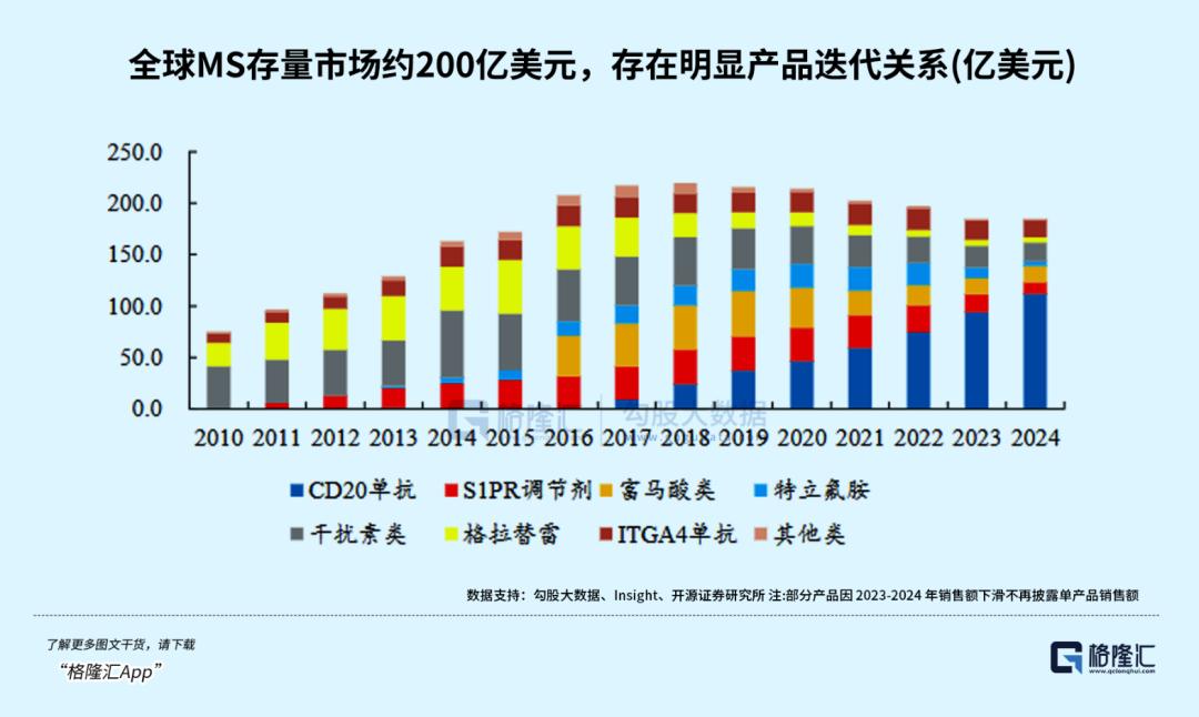 2024年全球多发性硬化(MS)上市药物销售额约185亿美元,市场空间广阔。该领域产品已历经三代迭代:初代以干扰素类等为主;二代是2010年后获批的S1PR调节剂等口服制剂,逐渐成为主流;三代核心为CD20单抗,2024年销售占比超60%,其中奥瑞利珠单抗自2017年上市后销量快速增长,2024年销售额达76.4亿元、同比增7.4%,充分体现了三代产品的市场竞争力。
