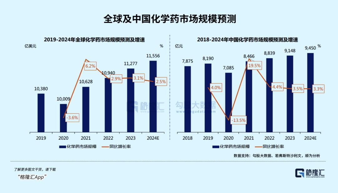 数据显示,全球化学药市场规模从2019年的10380亿美元增长至2023年的11277亿美元,中商产业研究院分析师预测,2024年全球市场规模将进一步攀升至11556亿美元。