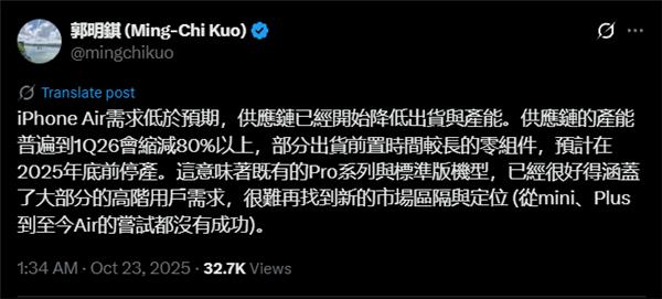 因为从全球市场的销量来看,即使在eSIM办理轻松并且同步上市的欧美国家,iPhone Air的销量也相当一般,受此影响,甚至传出苹果已通知代工厂,暂停了80%以上的iPhone Air代工生产。
