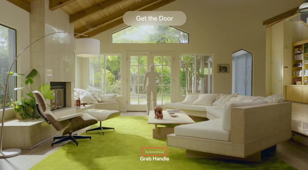 那么请问机器人熟悉啥工作呢?在 NEO 近十分钟的宣传片里,什么收衣服吸地做园艺花里胡哨整了一堆,结果只有两个动作用小字标出了 “ 自动 ”—— 一个是开门,一个是接杯子,其它全是人工实现智能。
