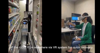 但是,有 4% 的可能,机器人会不小心把货掉到地上。这时候就要远程摇人,把远在菲律宾的 “ 专家 ” 叫来,通过 VR 控制机器人捡起瓶子,重新摆到货架上。